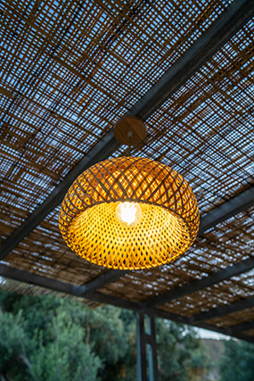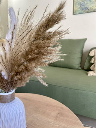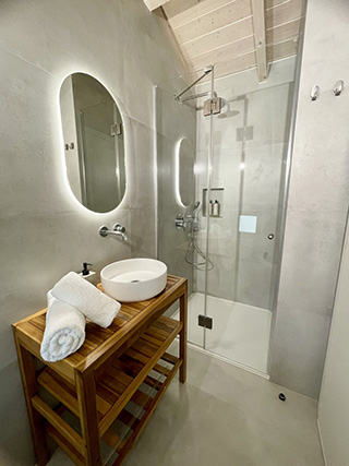 The internal staircase leads to the upper floor, where you will find the open space bedroom, in earth tones that offer calmness and relaxation. The double bed has an anatomical and hypoallergenic mattress. On the terrace of the maisonette, overlooking the pool and the garden, there is a large dining room for 4 people to enjoy their meal.